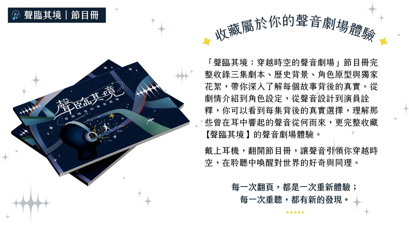「聲臨其境:穿越時空的聲音劇場」是一檔約20-30分鐘的沉浸式廣播劇場,融合歷史知識與戲劇表現,帶來獨特的聲音旅程,讓每一集都是一次精心策劃的時空之旅。